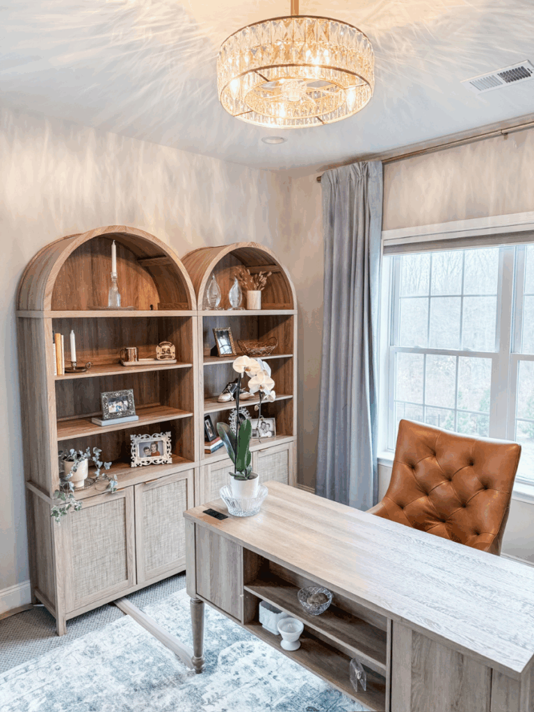 The light fixture we chose casts a stunning glimmer throughout the entire room. And you may be shocked to know this stunner of a light fixture doubles as a ceiling fan. They’re called fandeliers, and I love them! This fandelier brings a touch of feminine glamour to the space and makes the whole office feel polished and special. I love the way the shadows change throughout the day.