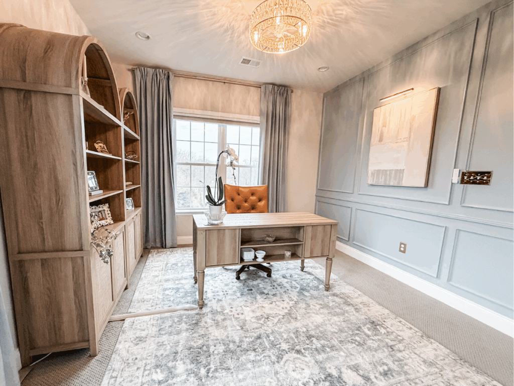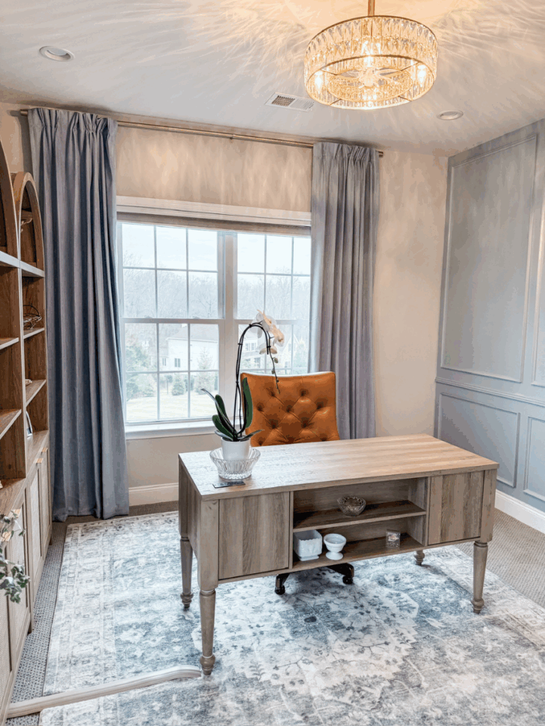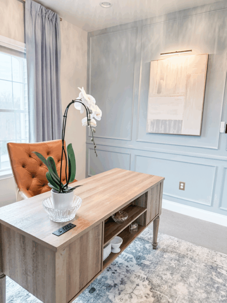 I chose Sherwin-Williams Stardew, a soft blue paint, for the trim wall. It’s just enough color to make the detailing pop without overwhelming the room. It’s subtle, elegant, and calming, and adds personality without shouting for attention. The right color can create a soothing backdrop for the rest of the design. We definitely got the color right in this office transformation.