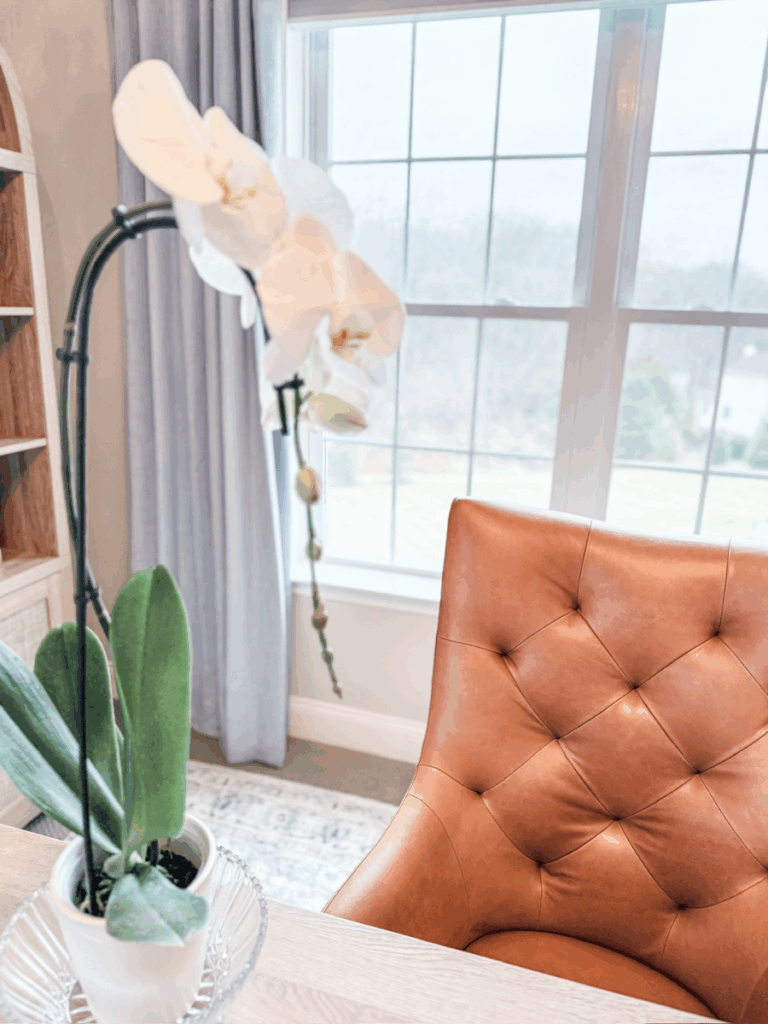 In a space filled with soft blues and gentle grays, the room needed a touch of warmth to avoid feeling too cool or monochromatic. Luckily, the homeowner already had this beautiful caramel-brown desk chair, and it was exactly what the space needed. The rich tone adds depth, coziness, and balance. Not to mention that using what you already have is great for the budget!