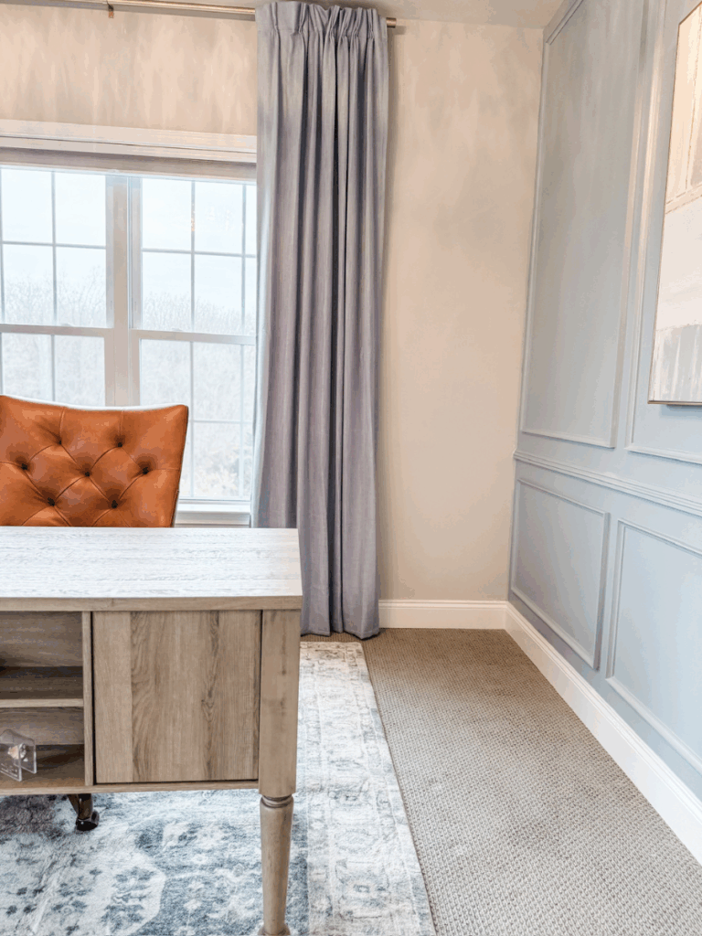 The blue in the curtains pulls the trim wall color into the rest of the office, creating a cohesive flow instead of letting that feature wall stand alone. The oriental-style rug adds visual interest while still honoring the same soft color palette. It’s a perfect example of how pattern and color can work together to make a room feel intentional.